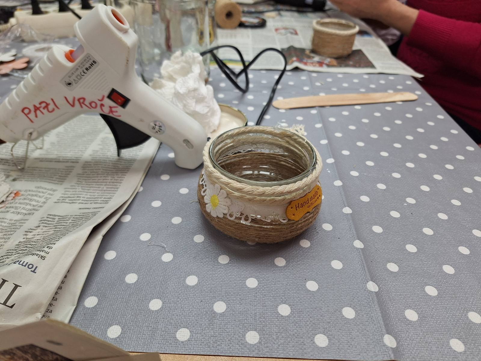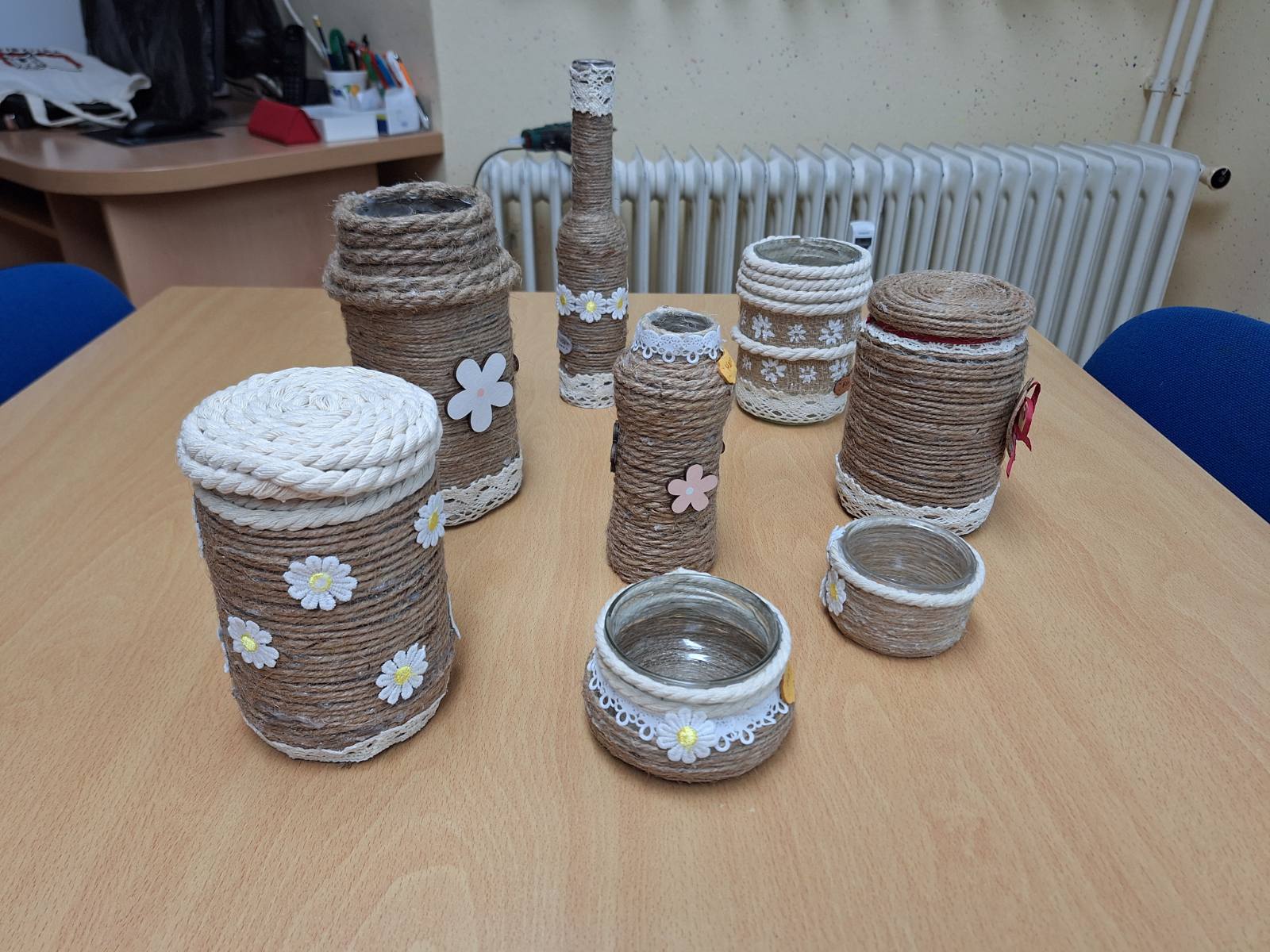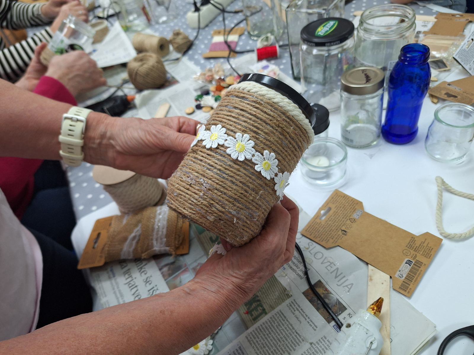 Okraševanje kozarcev in steklenic za vaze, šatulje…z vrvjo, žaklovino, lesenimi okraski…