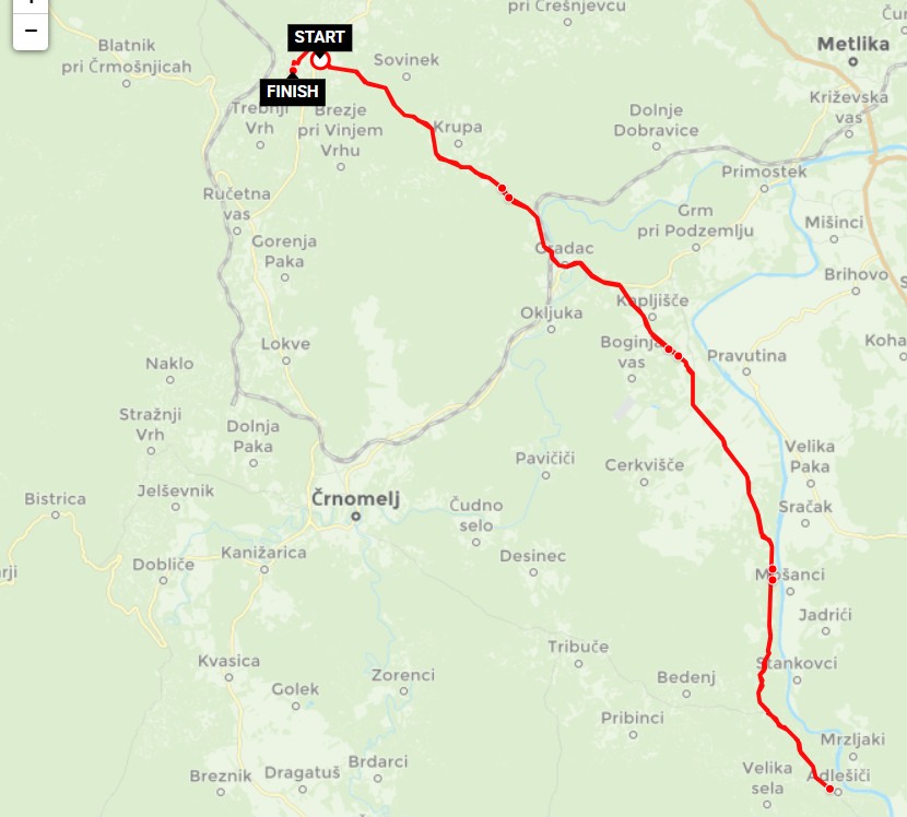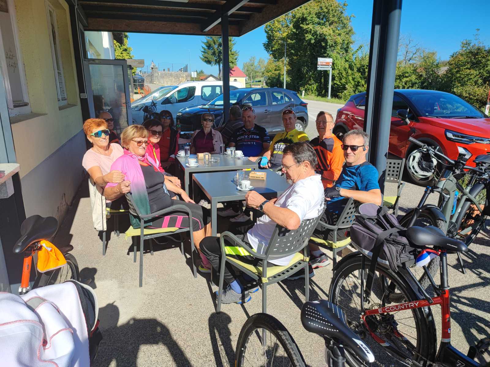 S kolesi iz Semiča v Adlešiče na kavico in nazaj. 12 kolesarjev, od tega 5 žensk in dva na žgance. Prevozili so 41 km, čas 2:27:06, pridobljena višina 315 m.